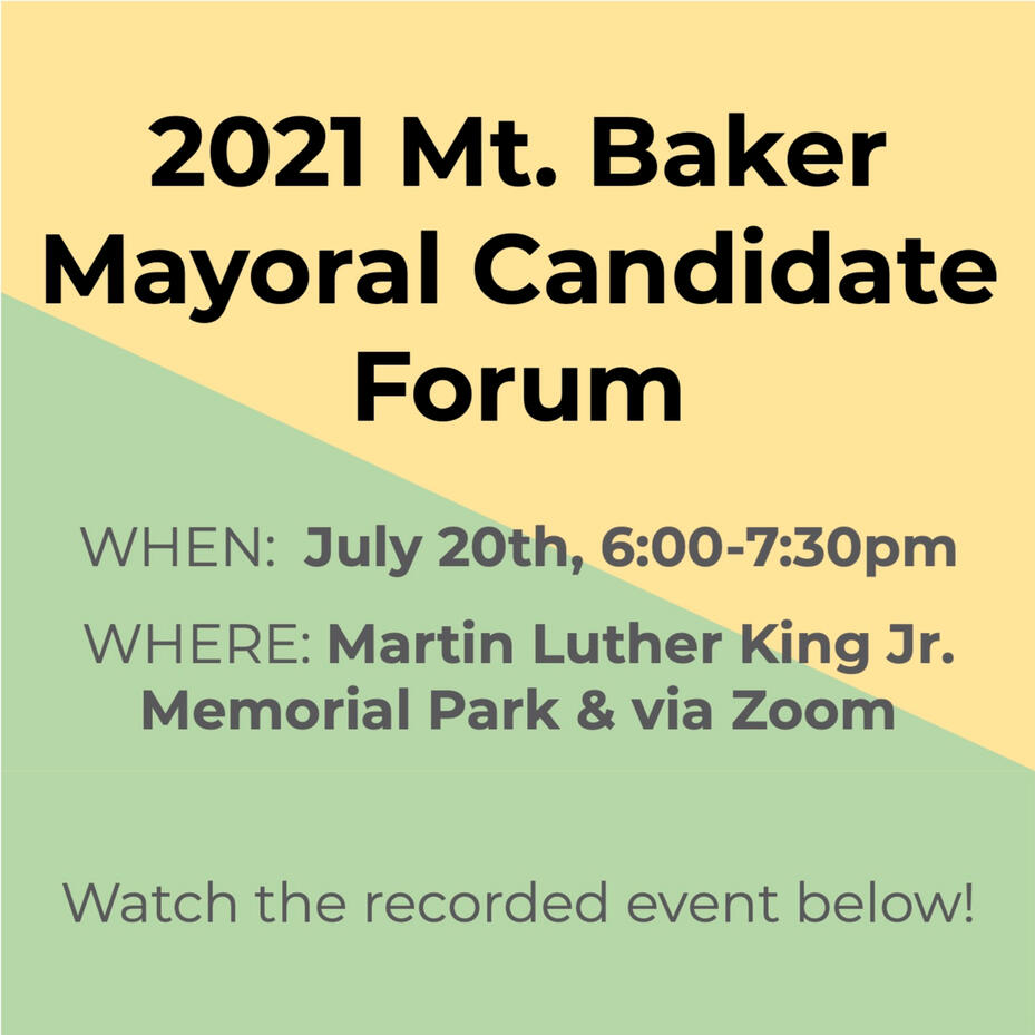 On July 20th, 2021, five candidates running for Mayor of Seattle attended a community forum at Martin Luther King Jr. Civil Rights Memorial Park. Candidates in attendance were Jessyn Farrell, Bruce Harrell, Lance Randall, Don Rivers, and Casey Sixkiller. During the forum, we asked six questions about how challenges facing the City of Seattle specifically impact the community of Mt. Baker and Southeast Seattle. The questions integrated nearly 30 audience questions that were submitted in advance into 6 topical questions. Watch the recorded forum here or on Youtube!